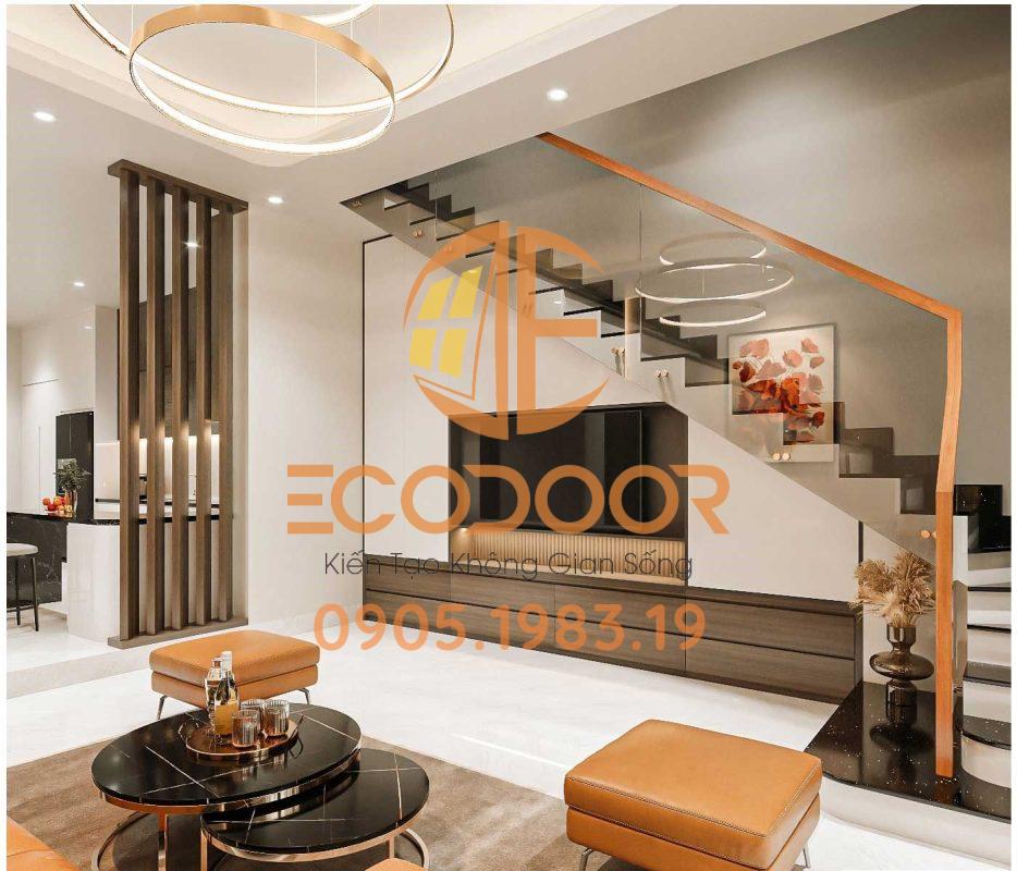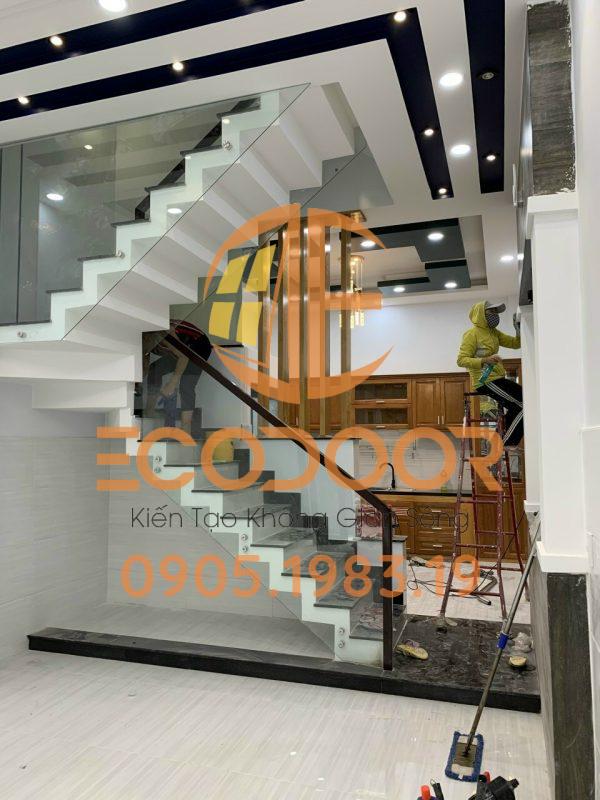 Cầu thang kính tạo cảm giác không gian rộng hơn. Độ trong suốt giúp ánh sáng xuyên qua dễ dàng. Nhà nhỏ trở nên thoáng đãng, hiện đại. Thiết kế này phù hợp với nhà phố tại Đà Nẵng. Eco Door đảm bảo thi công chính xác, thẩm mỹ.