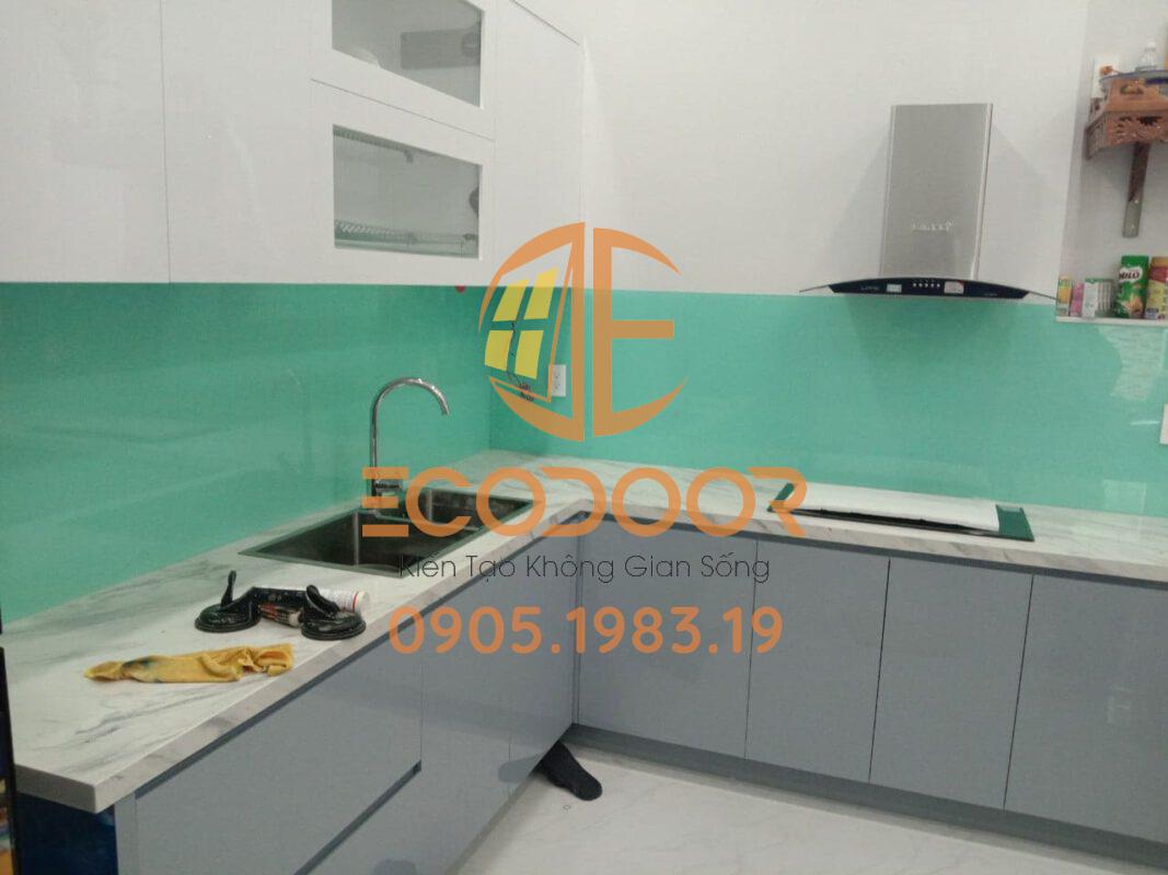 1. Tủ bếp chữ L với kính ốp bếp Quảng Nam màu xanh ngọc